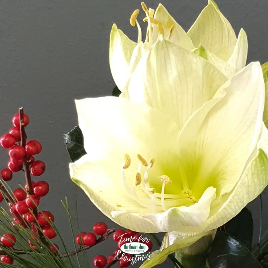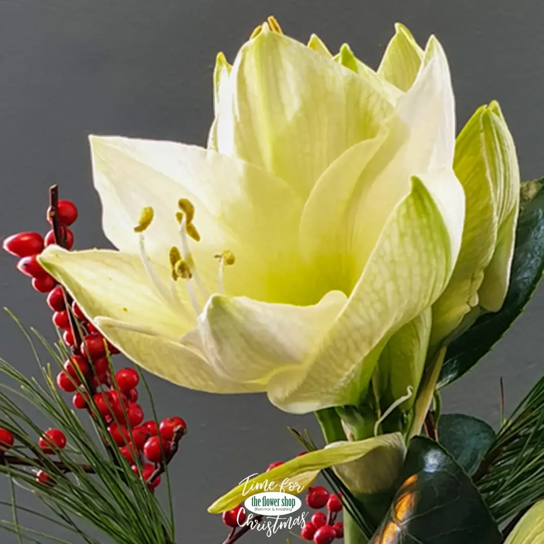 Embrace the festive spirit with our stunning White Amaryllis bouquet, adorned with winter greens and vibrant red Ilex berries. The Noelle is our holiday creation that brings the magic of Christmas to life in this breathtaking blend of seasonal beauty. ‘Tis the season to bloom in style!